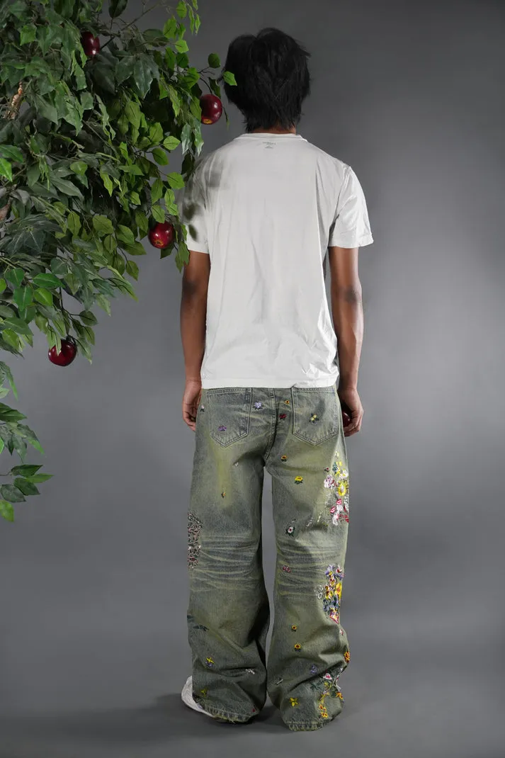 These wide-leg denim pants are crafted from 14oz pre-shrunk cotton denim, offering durability with a structured silhouette. Intricate stitching adds depth and craftsmanship to the design.
