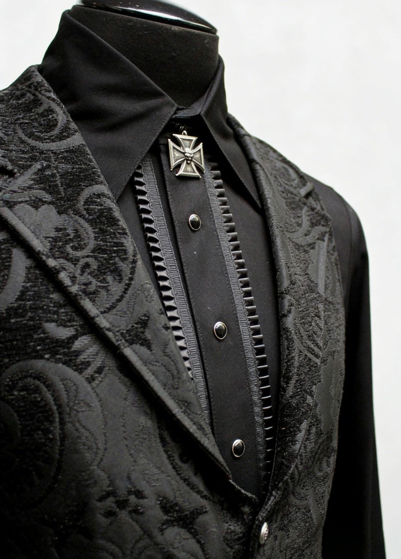 This Aristocratic Vest is Victorian-inspired and tailored from black brocade with satin lining, offering a polished silhouette for formal occasions.