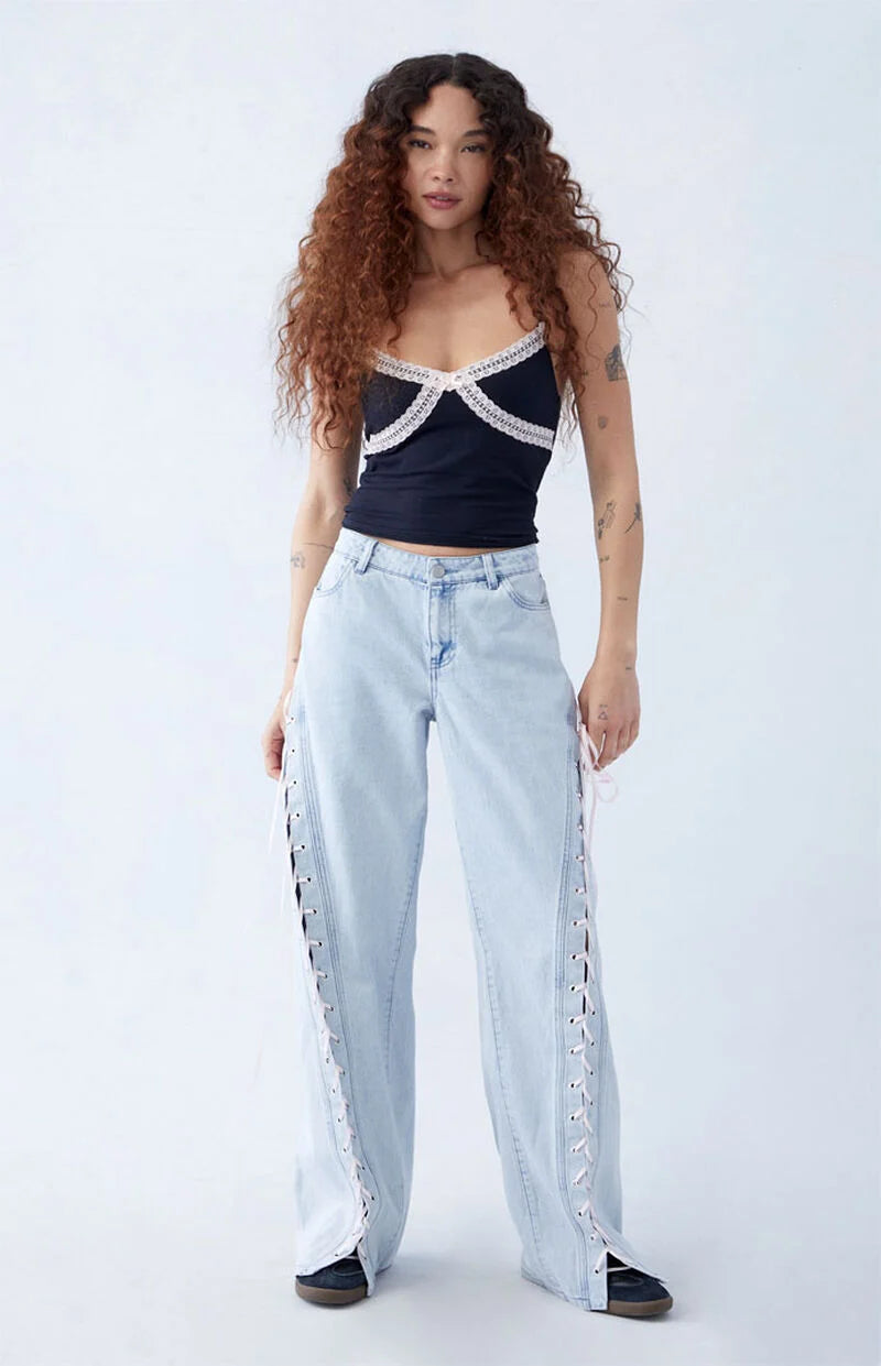 Embrace effortless comfort and style this season with these Light Indigo Bow Ribbon Lace Up Low Rise Baggy Jeans. Crafted from durable rigid cotton, these flirty low-rise jeans elevate your look with an ultra-slouchy relaxed leg and a comfortable baggy fit. They feature lace-up details down the legs for a coquette-inspired look.