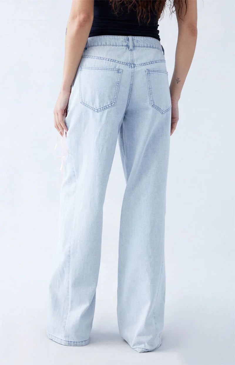 Light Indigo Bow Ribbon Lace Up Low Rise Baggy Jeans