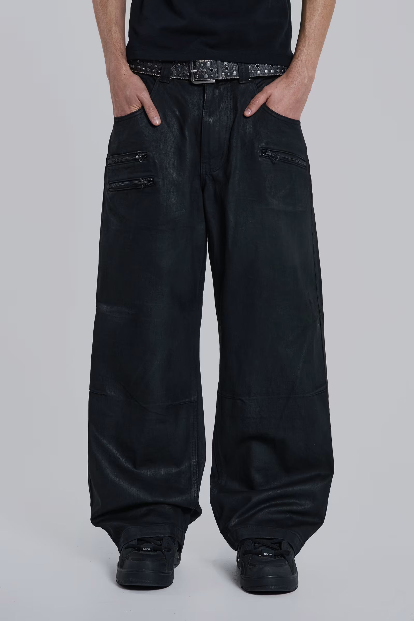 Coated black denim jeans featuring zip teeth at the waistband edge and triple zip detail pocket styling. Metal rivets and inside leg darts create a structured, edgy silhouette.