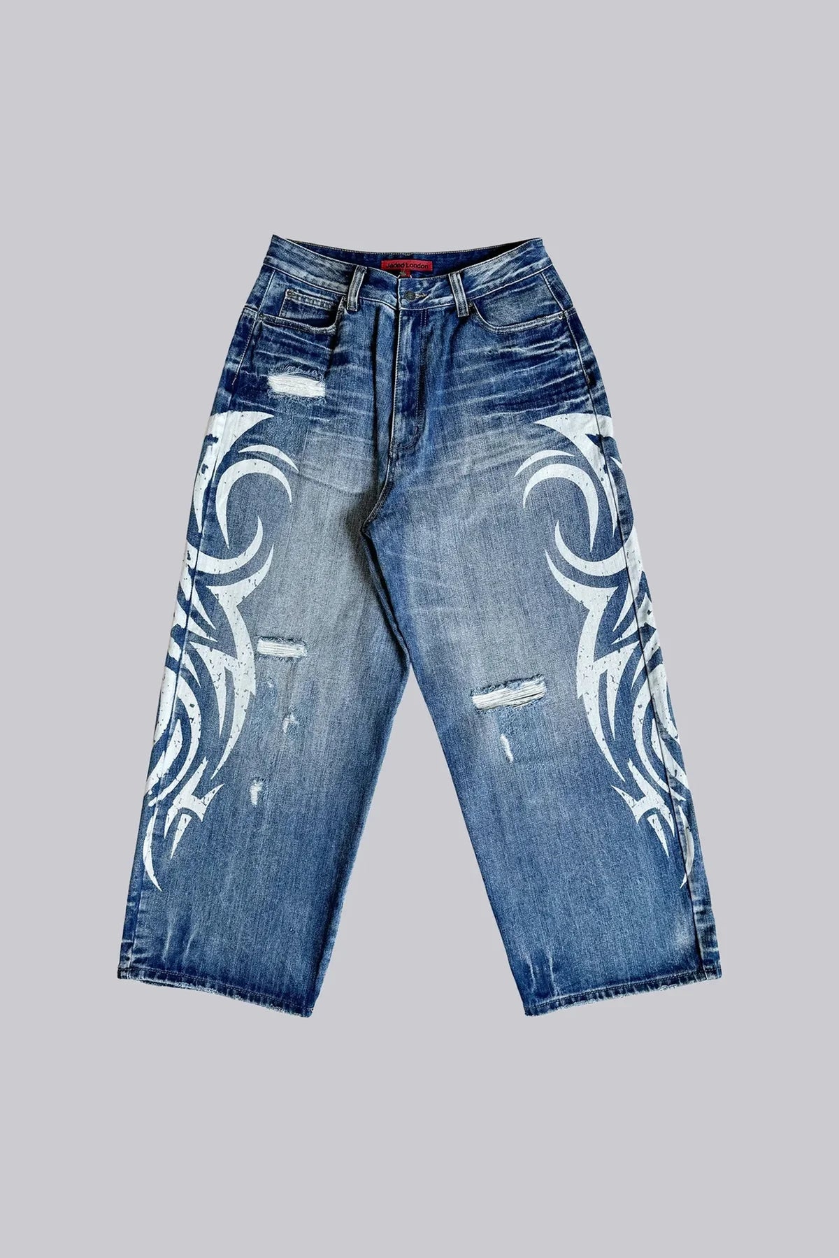 The discharge tattoo screen printing along the sides and back, combined with distressed detailing, adds a bold streetwear edge.