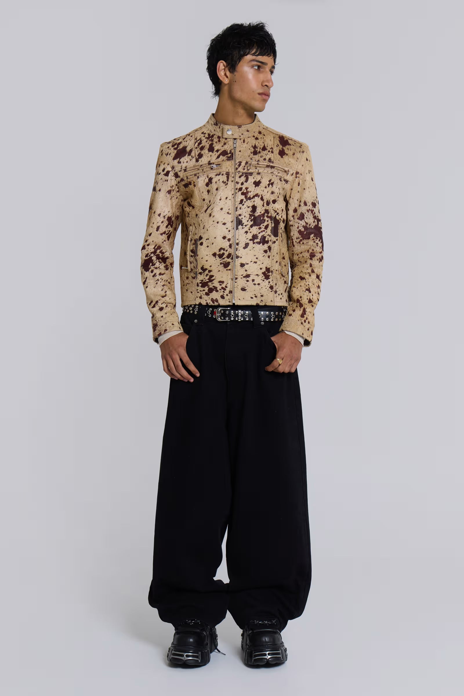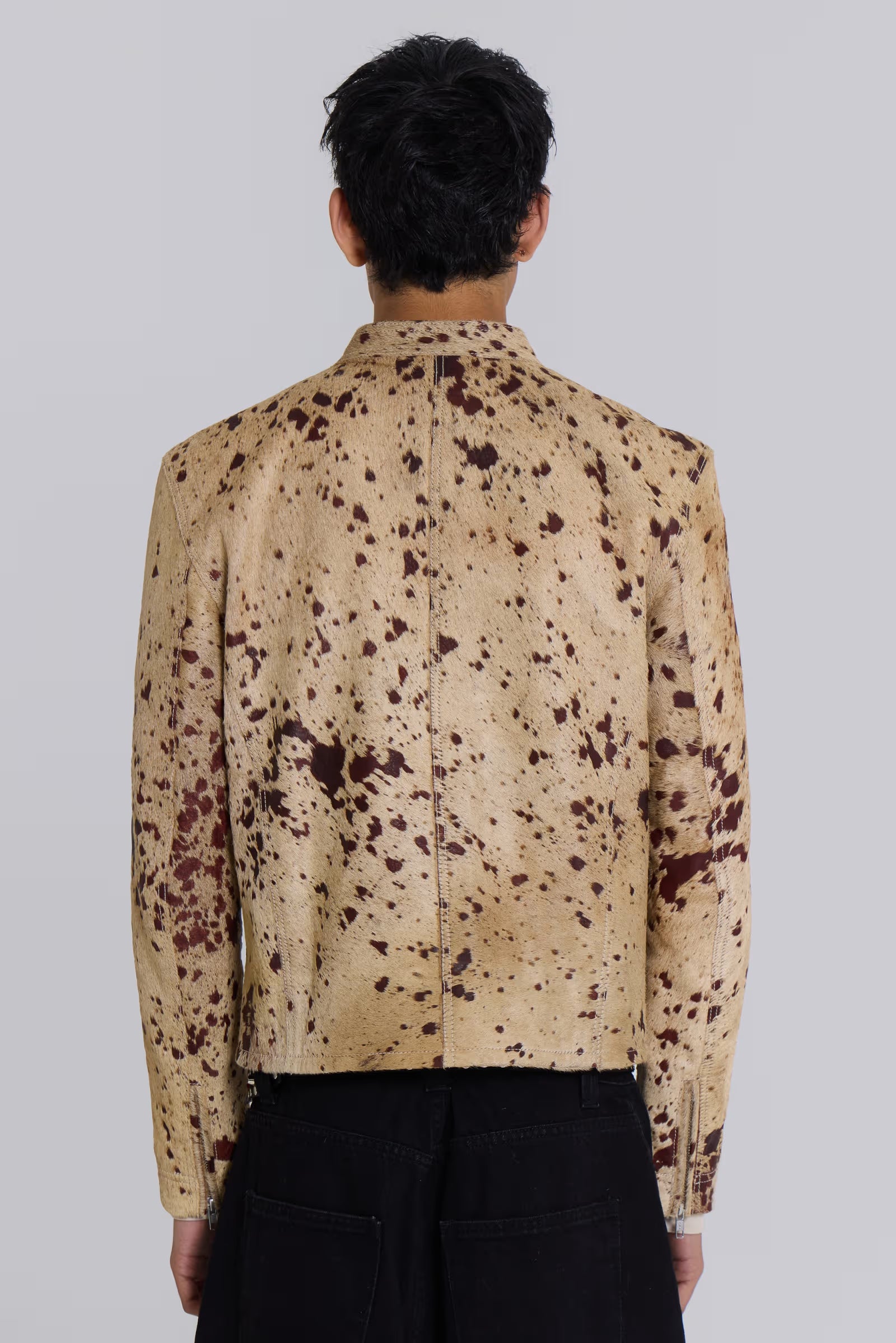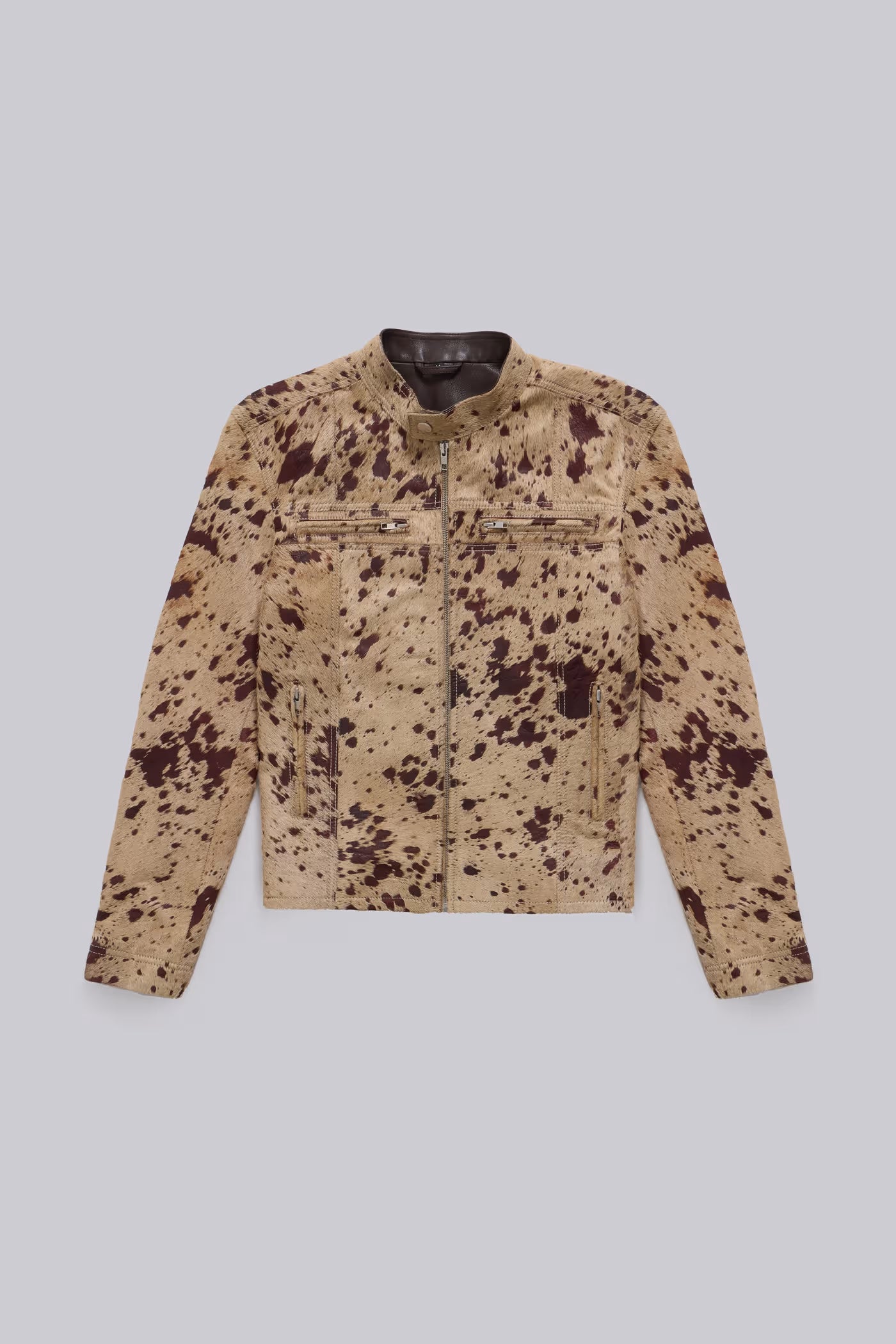 A genuine cowhide leather jacket with a distinctive speckled print and "pony" look finish. The shrunken fit and moto style neckband create a sleek, contemporary silhouette.