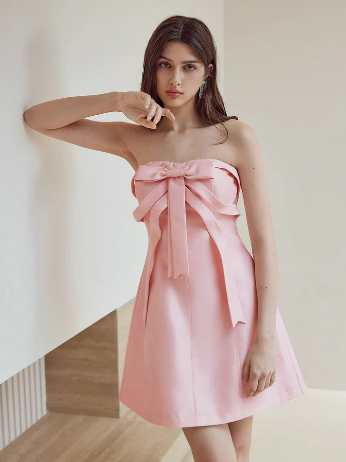 This pink bow-embellished dress is designed with a flattering A-line silhouette—easy to style, easy to wear. Featuring delicate spaghetti straps, an open back, and a statement bow detail, it brings a playful yet elegant charm perfect for parties and special occasions.