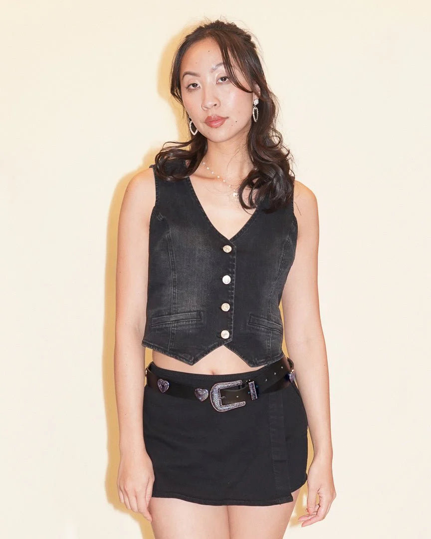 Edgy yet stylish, the Harper Black Sleeveless Denim Vest is the perfect addition to your wardrobe. Crafted from stretch denim, it can be worn on its own or layered over your favorite graphic tee. The adjustable button detailing offers both practicality and aesthetic appeal.