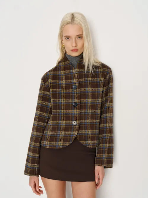This collarless jacket is designed with a loose, slightly oversized silhouette—easy to style, easy to wear. Featuring a clean button-down front, it delivers a relaxed yet polished look for everyday layering.