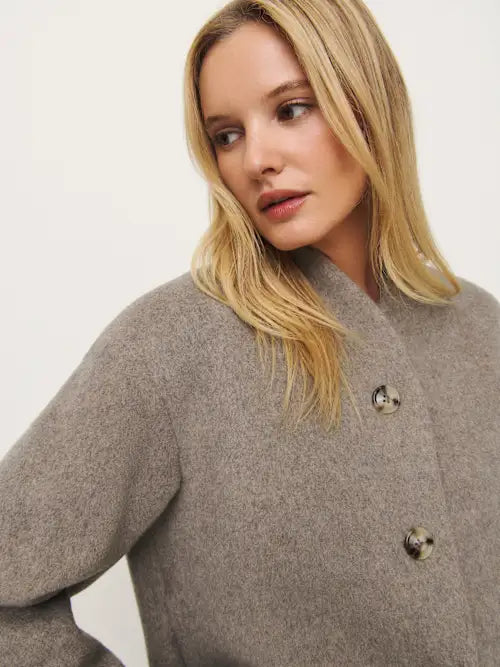 Collarless, loose-fitting jacket with button-down front