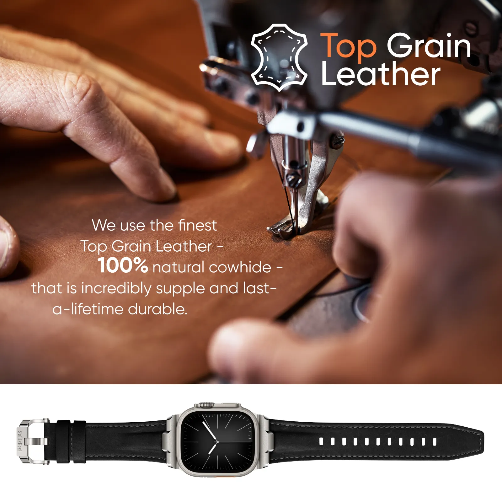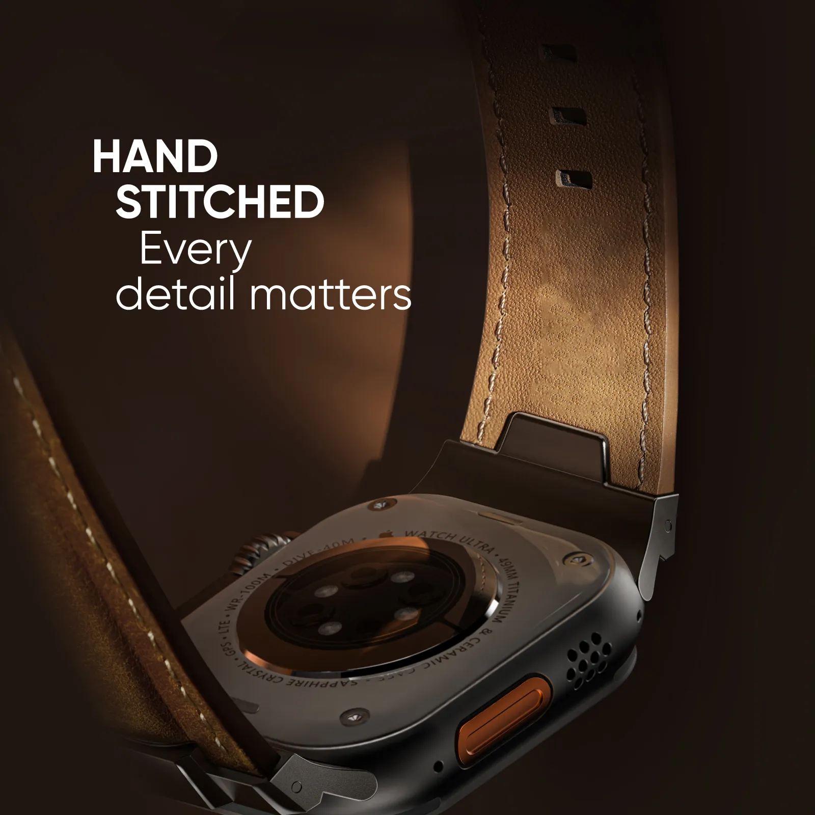 This premium leather strap for Apple Watch is crafted with exquisite attention to detail, featuring a 3D sculpted connector and polished beveled edges that seamlessly blend with the sleek lines of your Apple Watch Ultra. The perfect fusion of matte and polished finishes adds a modern, stylish touch to your wrist.