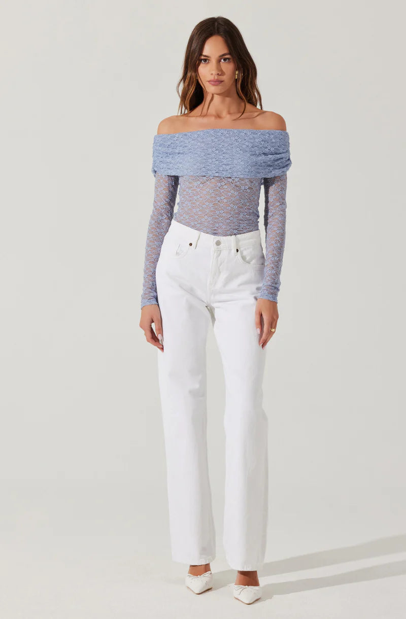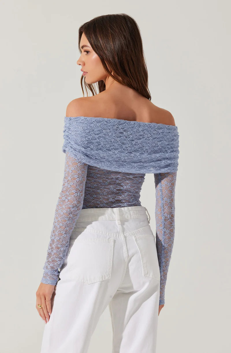 This diamond lace off-shoulder top is designed with a soft, fitted silhouette—easy to style, easy to wear. Featuring sheer lace through the torso and sleeves with a partially lined bust, it blends elegance with a modern, feminine edge.