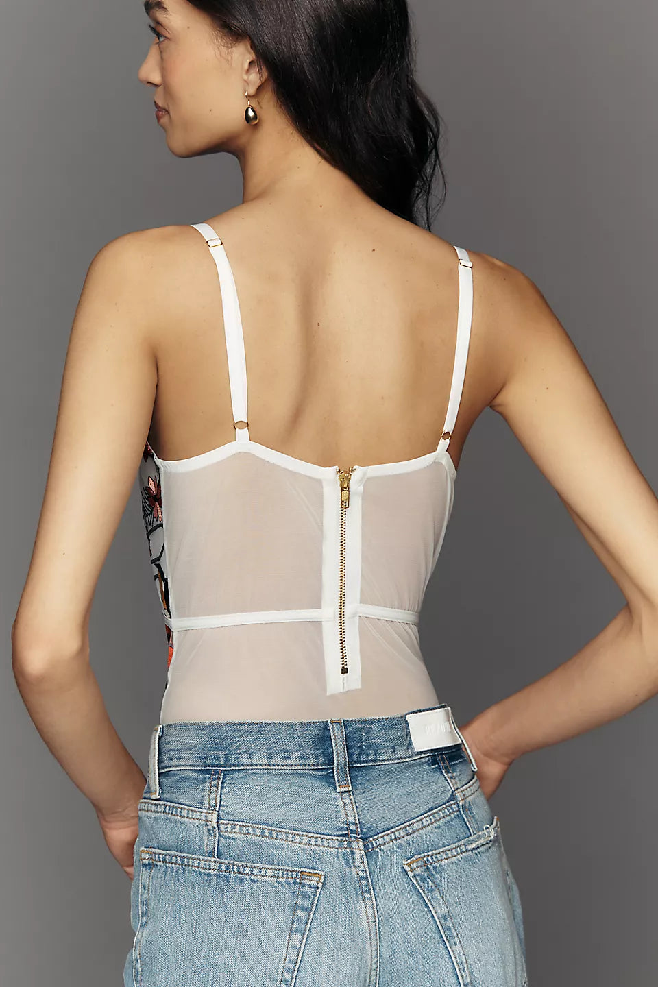 • Sheer mesh fabric with floral embroidery
