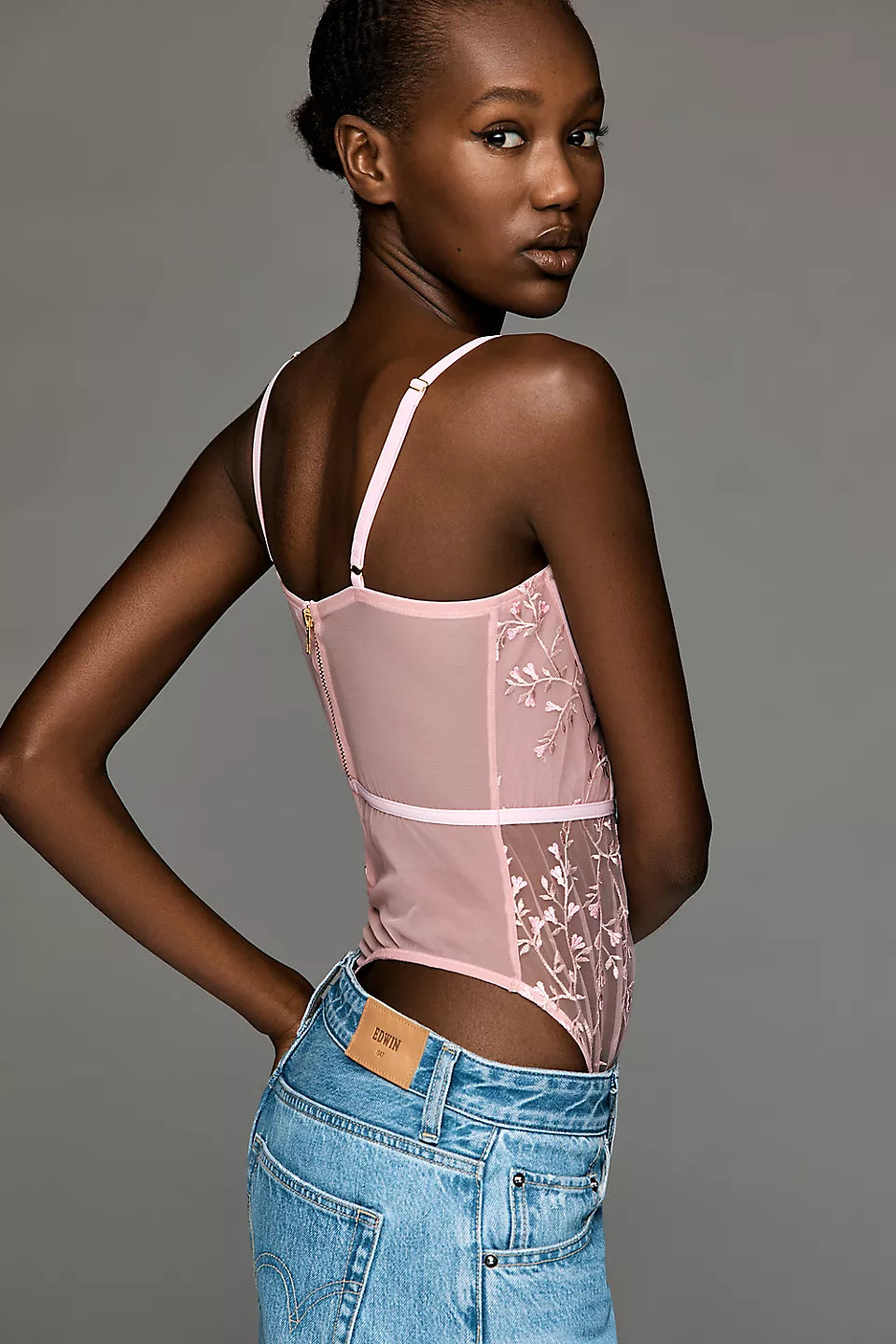 Floral Mesh Bodysuit featuring delicate floral embroidery and sheer mesh panels. The romantic design offers a captivating balance of coverage and allure.