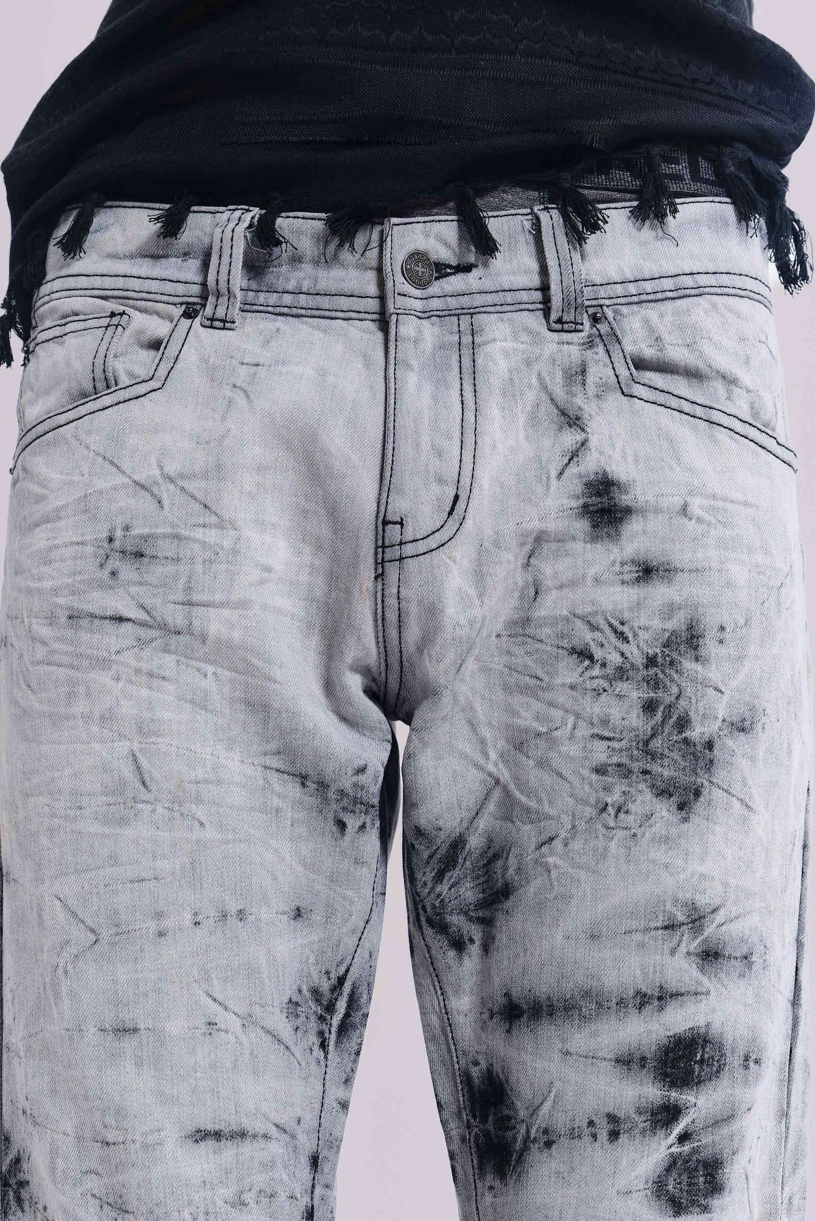 These gray tie-dye flared jeans are designed with a low-rise fit and a wide flared leg for a bold, retro look. The skirted hem adds a unique twist to the classic denim.