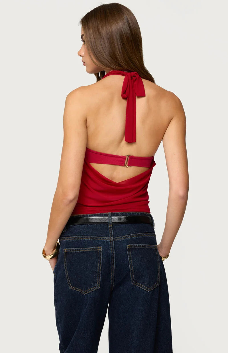 The Layered Bra High-Neck Top is designed to make a bold yet refined statement. Featuring a striking backless silhouette and a modern layered-bra construction, this piece highlights your figure while maintaining a sleek, fashion-forward aesthetic.