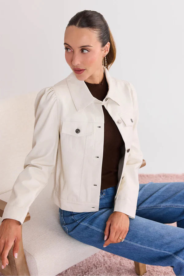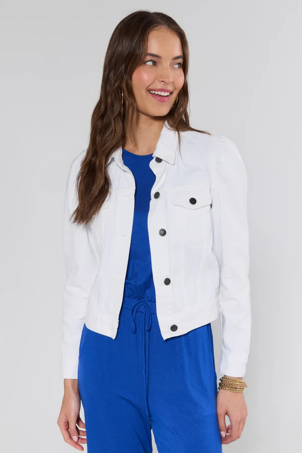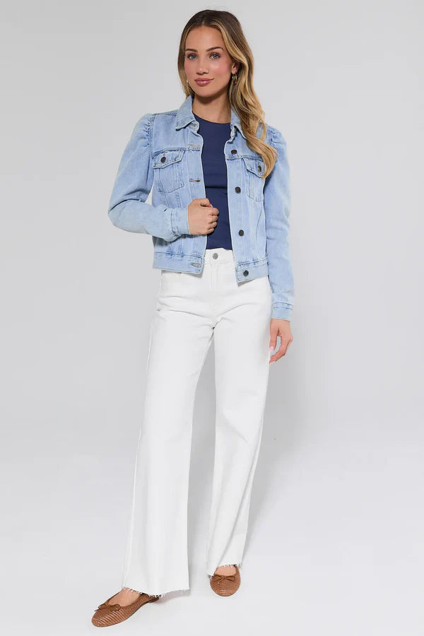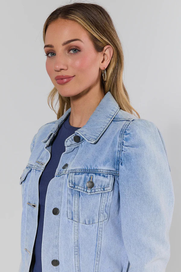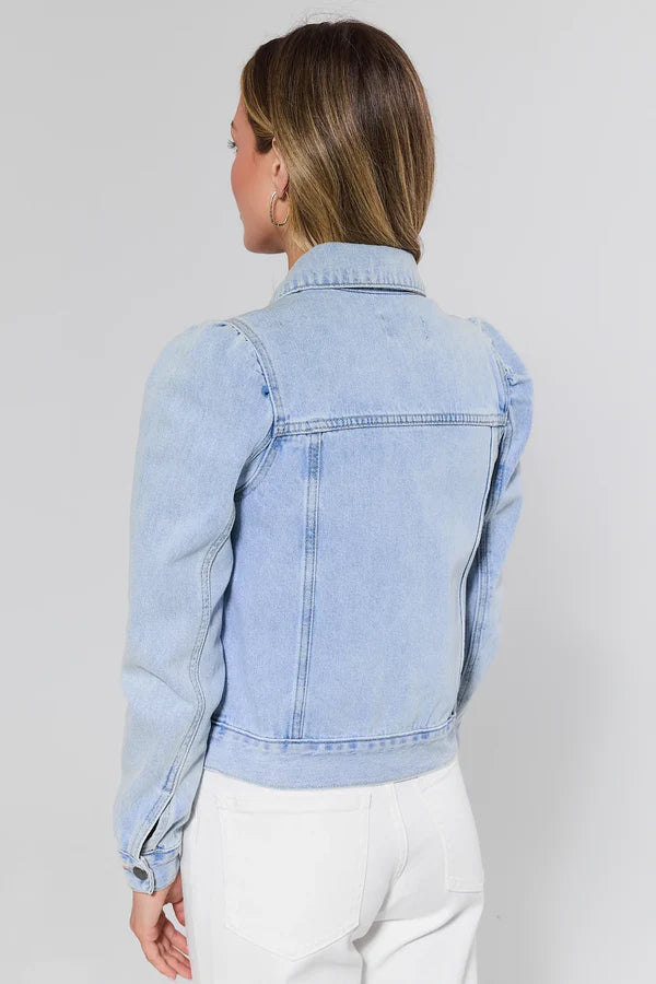 This light wash denim jacket is designed with a breathable, lightweight fabric and a unique puffed shoulder detail. Pair it effortlessly with your favorite tops or dresses to create a stylish look that works year-round—a versatile must-have for every season.