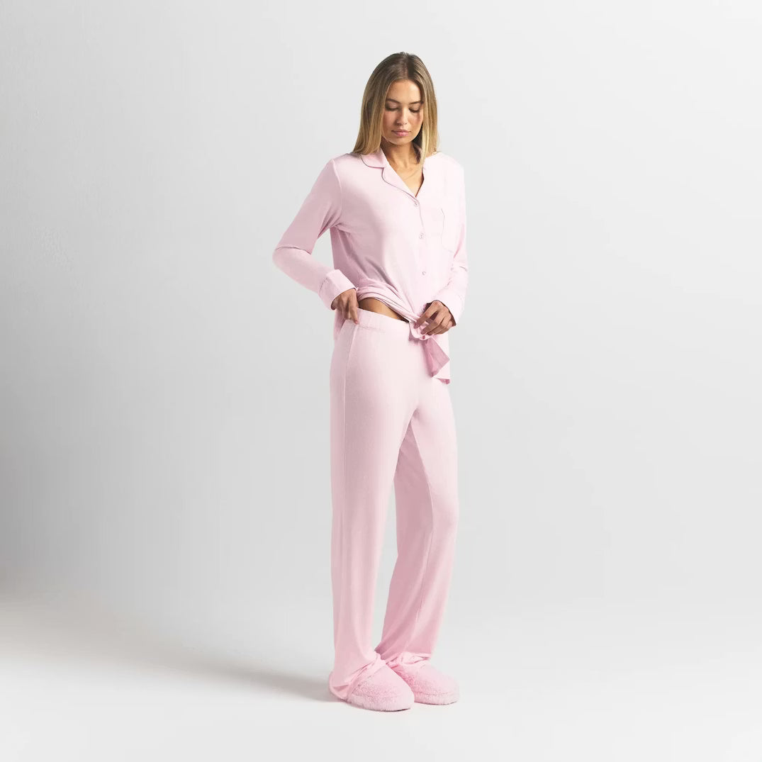 Your old pajamas can't compete with this soft, ultra-comfortable sleep set. Features a slightly oversized button-up top with long sleeves, a chest pocket, and piping details. The straight leg pants have a relaxed fit and a stretchy waistband with an adjustable interior drawstring.