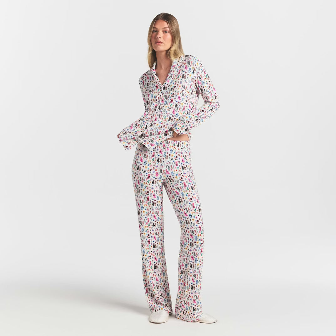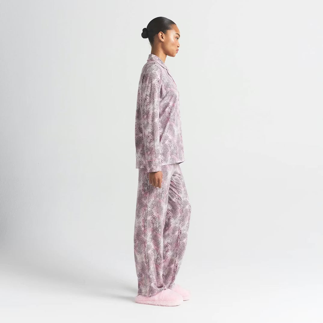 Wear as a matching set for lounging in luxurious comfort, or style the top unbuttoned over a tank with the pants for an elevated at-home look.