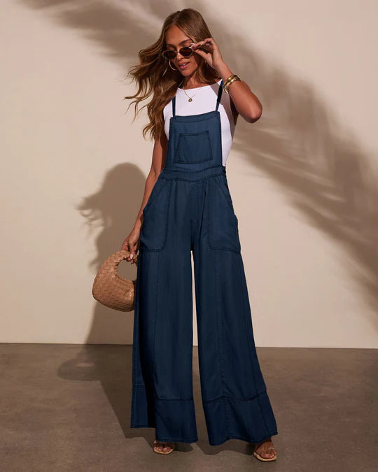 This loose-fitting denim jumpsuit is designed with a relaxed silhouette—easy to style, easy to wear. Crafted from lightweight chambray fabric, it features adjustable shoulder straps, side button closures, and functional front pockets for a casual, laid-back look.