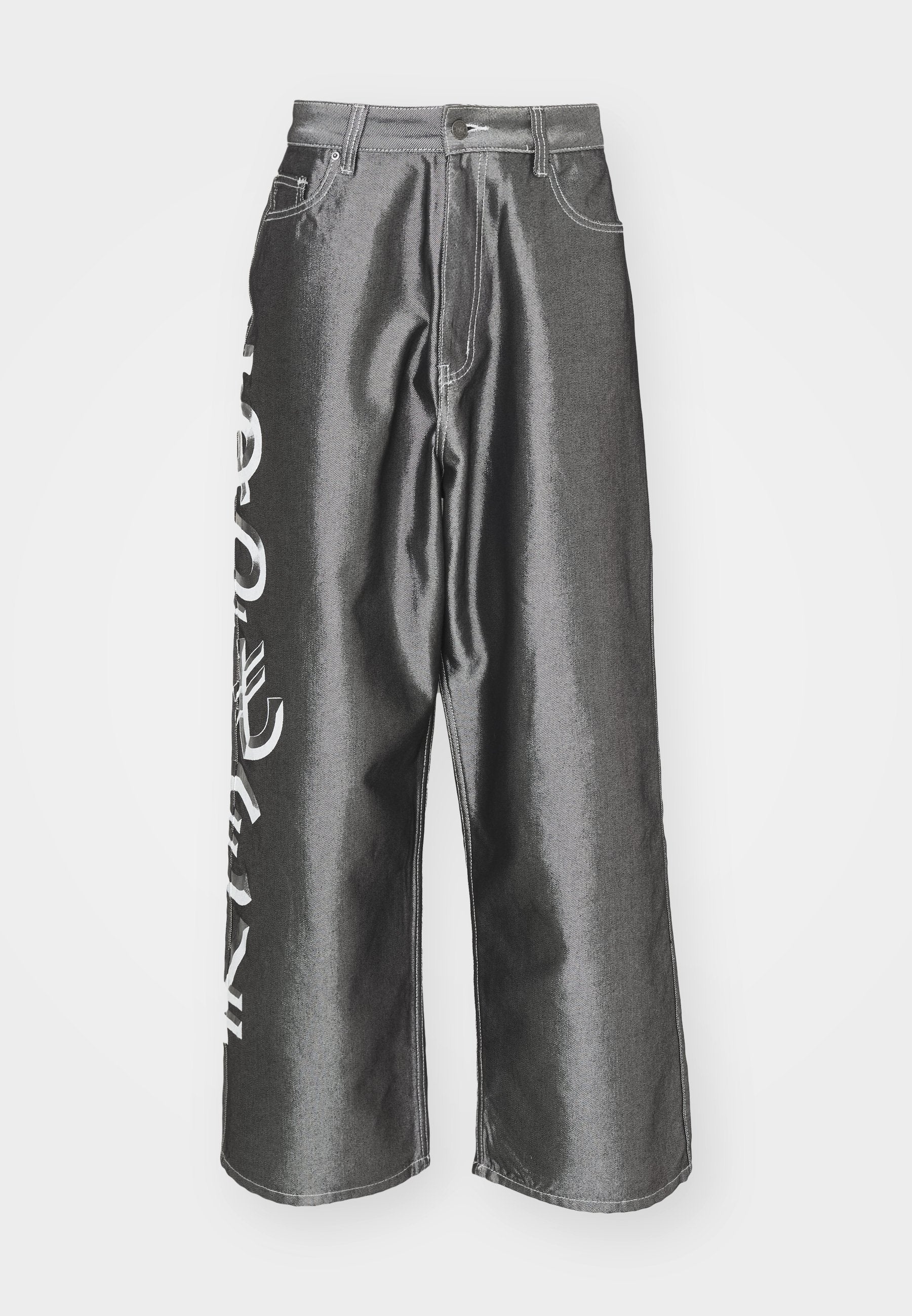 These loose silver flared jeans feature a relaxed silhouette with a flared shape for a clean and modern look. The silver-toned denim creates a bold statement while maintaining everyday versatility.