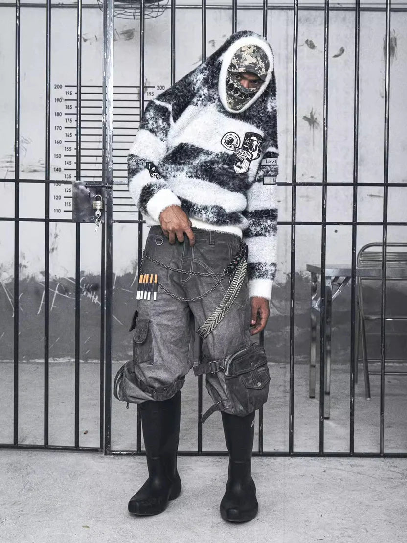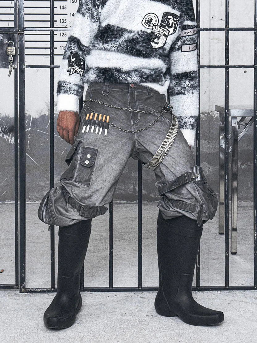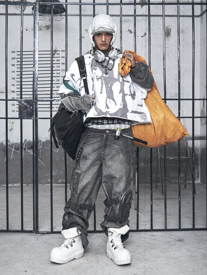 These multi-pocket work pants with suspenders are designed for durability and functionality. The recycled materials and structured design create a rugged yet modern look.