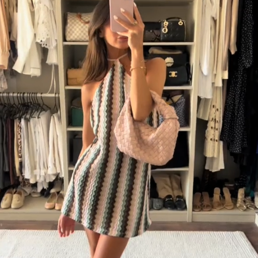 A halter mini dress featuring a self-tie closure and allover stripe design. Crafted from midweight fully fashion knit fabric, the semi-sheer construction creates a playful, layered look that's perfect for warm-weather dressing.
