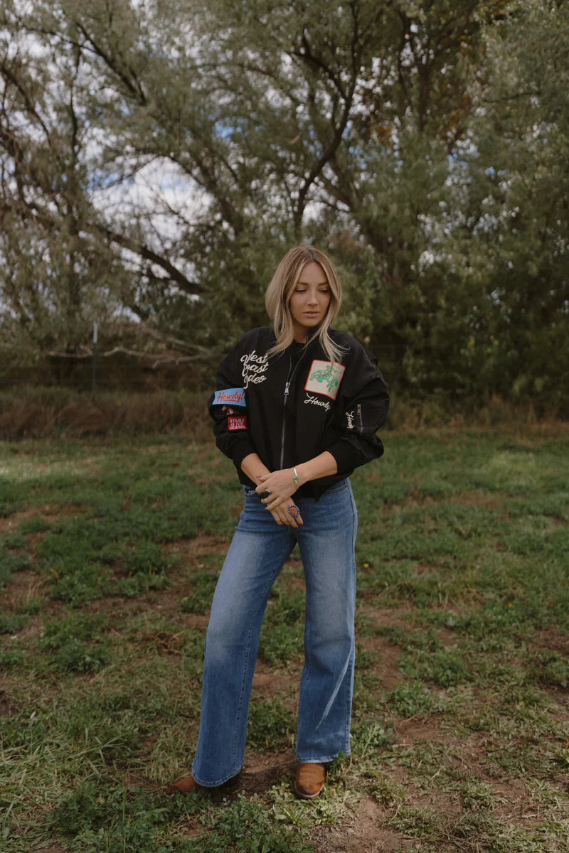 This Pilot Jacket combines classic denim, Western-style embroidery, and bold lettering for a stylish, unique look. Crafted from 100% nylon, it features ribbed cuffs and a waistband for a comfortable fit. The front zipper and side pockets add both functionality and style to this iconic jacket.