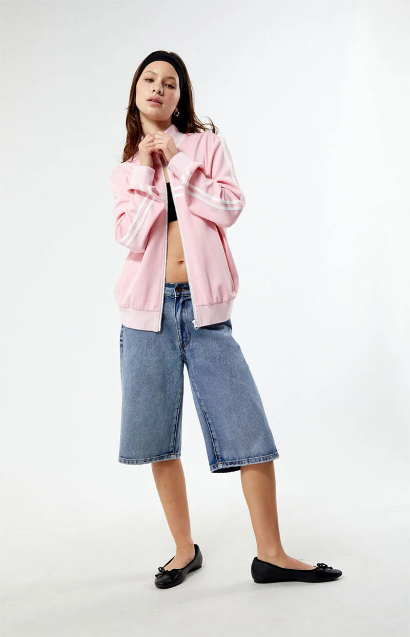Pair with matching track pants and sneakers for a coordinated athleisure look, or layer over a tank with leggings for effortless sporty-chic style.