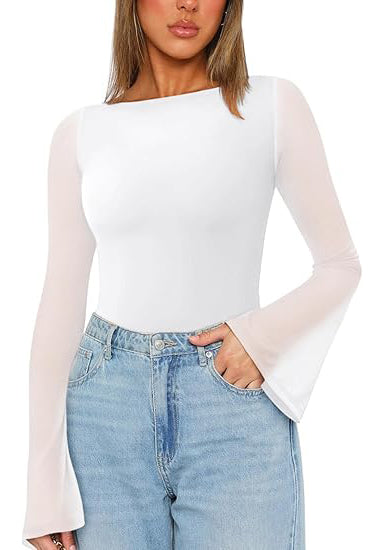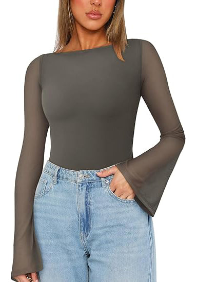 Women’s Fashionable Sexy Boat Neck Bell Sleeve Sheer Mesh Bodysuit Top