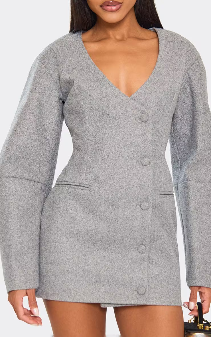 This gray wool blazer dress blends structured sophistication with playful details. The puff sleeves and button-front design add a unique touch to this timeless piece.