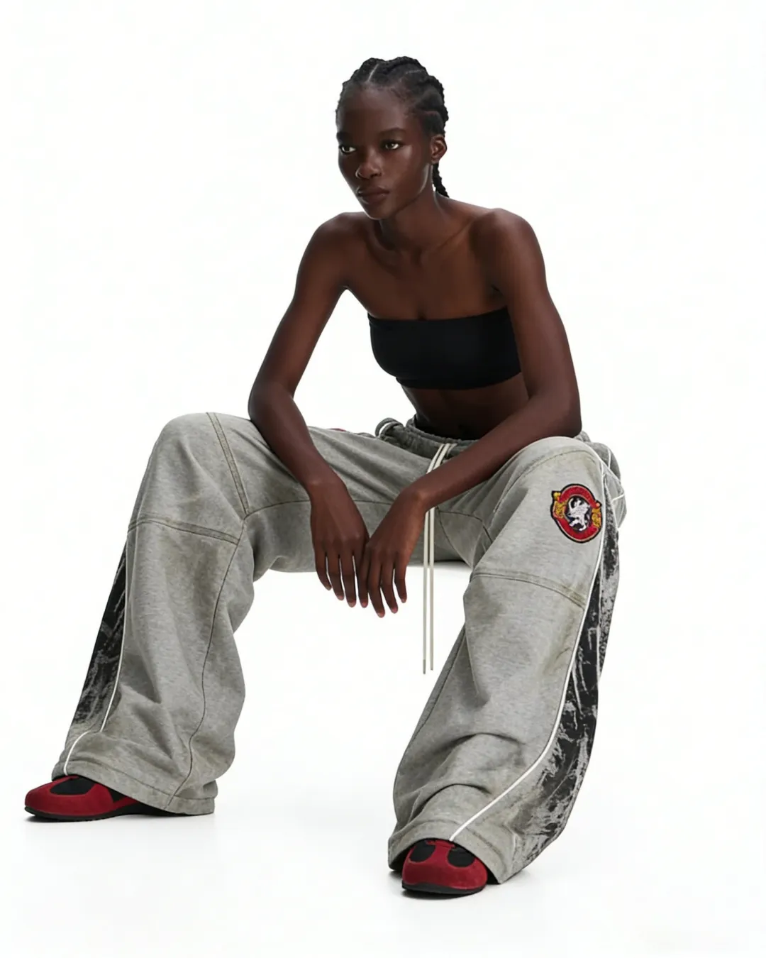 The Peoplesense Color-Blocked Double-Belt Track Pants combine bold street aesthetics with mechanical-inspired detailing, crafted from thick cotton-blend fabric with a distressed brushed finish and racing graphics at the knees for an industrial edge.