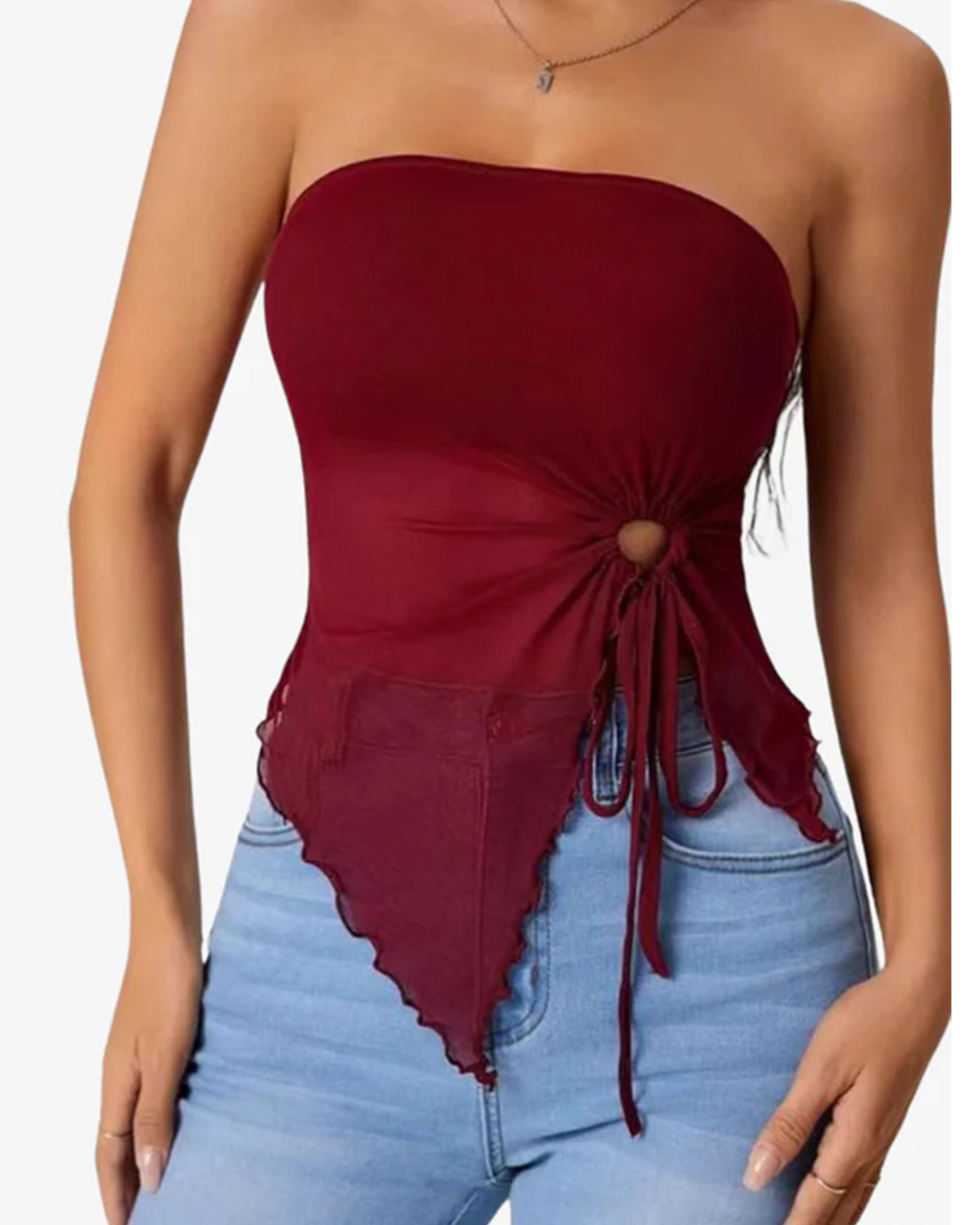 This asymmetrical hem tube top is designed with a sleek, body-hugging silhouette—easy to style, easy to wear. The side drawstring detail adds adjustable shaping, while the uneven hem creates a modern, eye-catching edge.